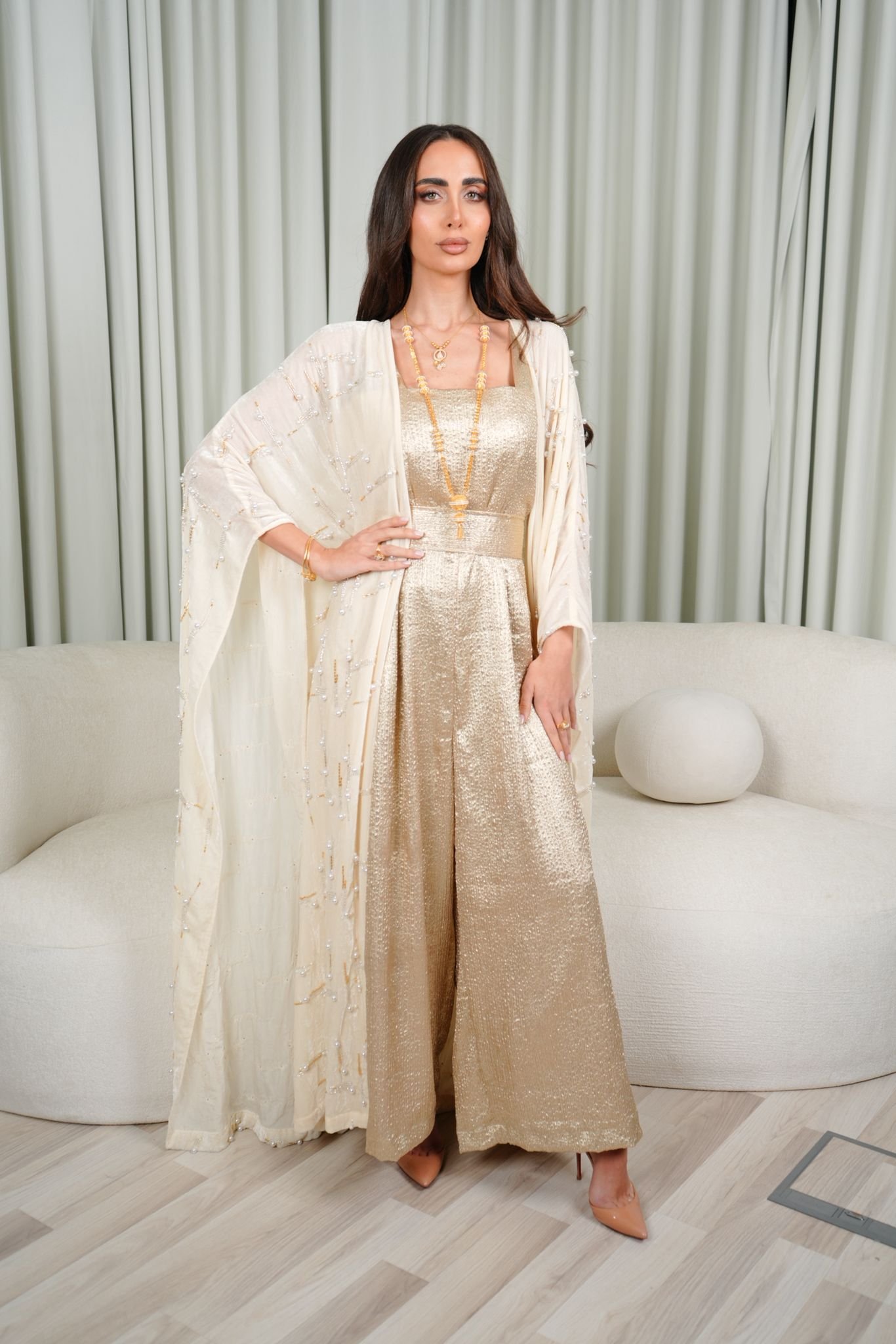 بدلة قطعتين(جمسوت جاكار حرير مع حزام ذهبي & بشت مخمل مشكوك مع اللولو)